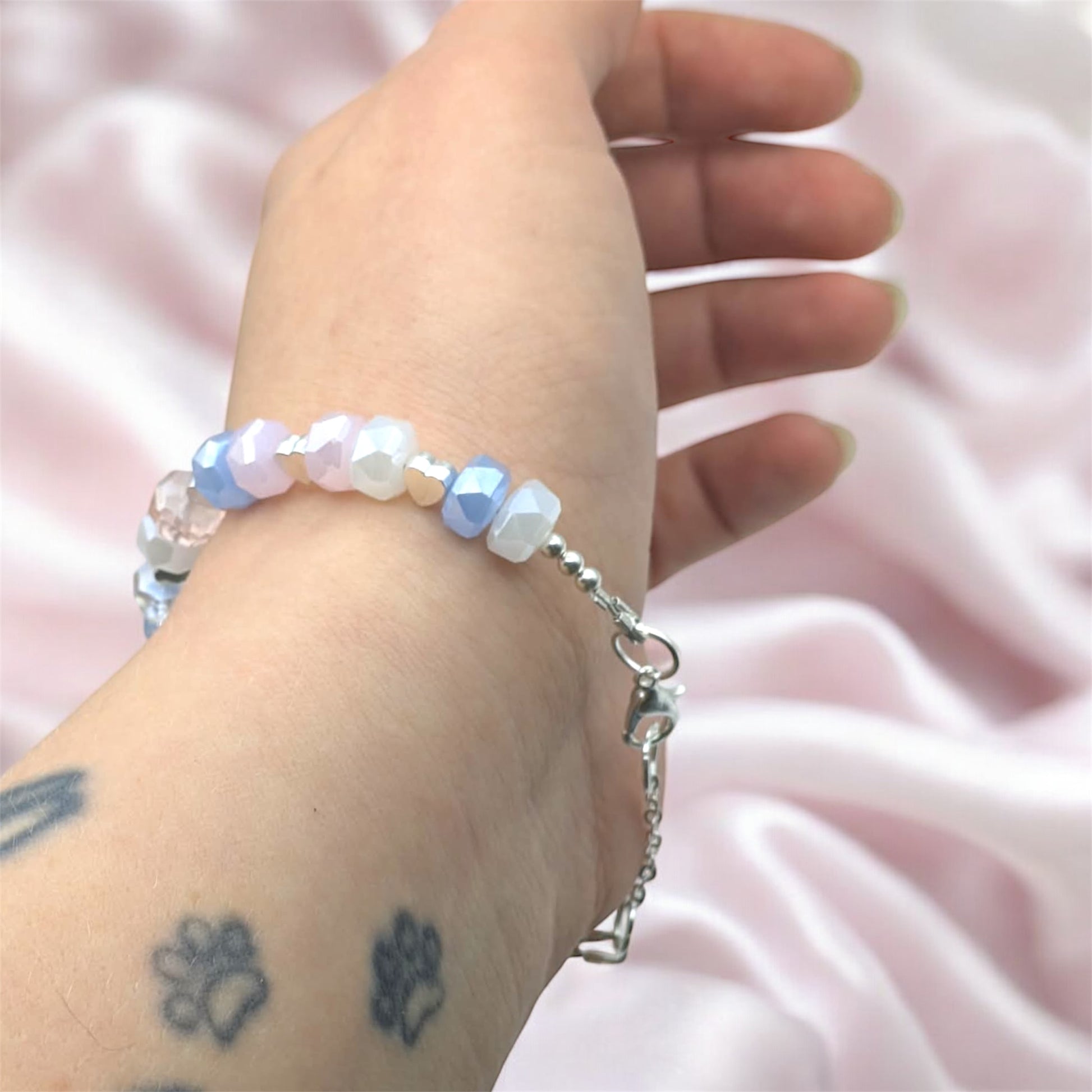 Discover the perfect gift for her with this stunning glass crystal faceted beaded bracelet. Each delicate bead catches the light beautifully, showcasing a dreamy mix of colors—soft pinks, tranquil blues, clear crystals, and frosted milky tones that create an elegant, ethereal sparkle.
