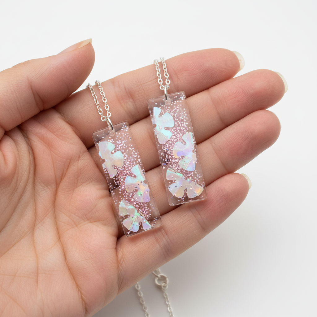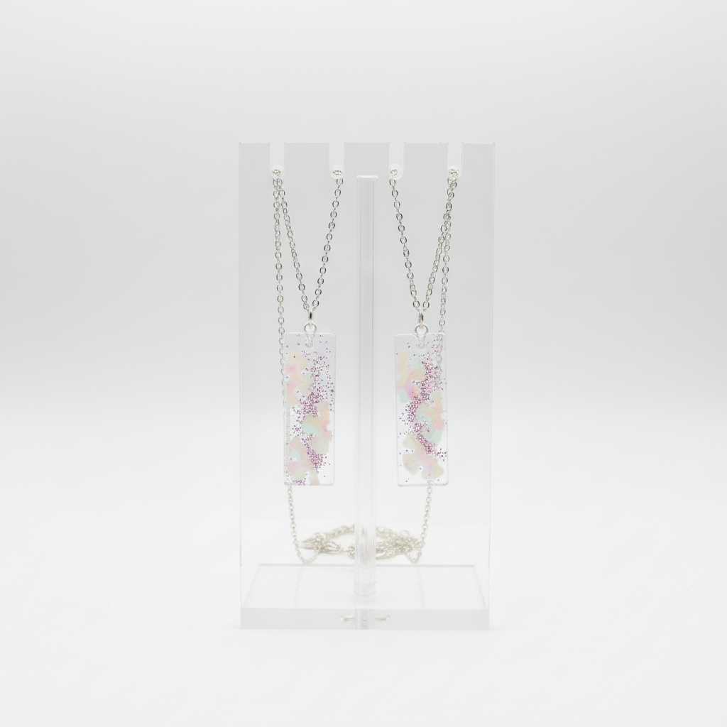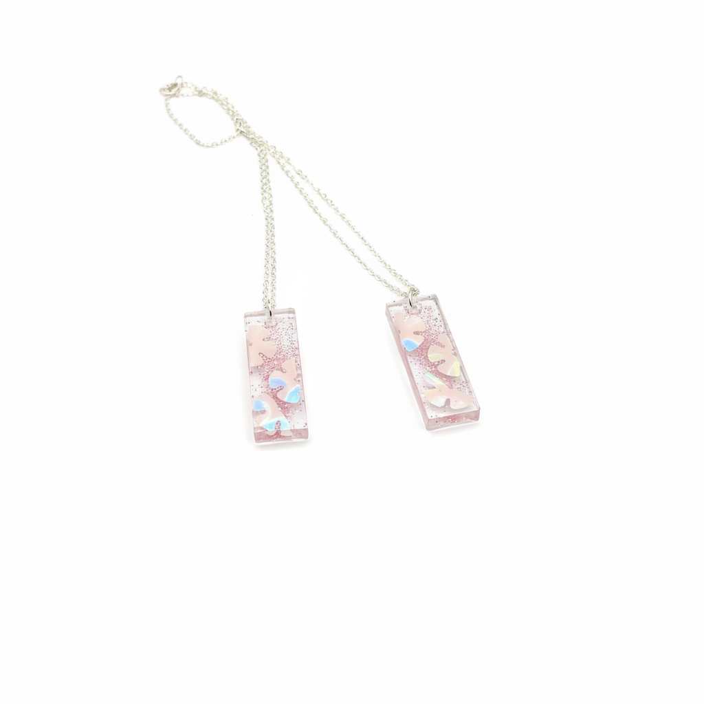 This beautiful set includes 2 handmade resin necklaces - one for mum and one for daughter. Each pendant features delicate iridescent flowers suspended in crystal-clear resin with a touch of pink sparkle, creating a magical keepsake you'll both treasure.